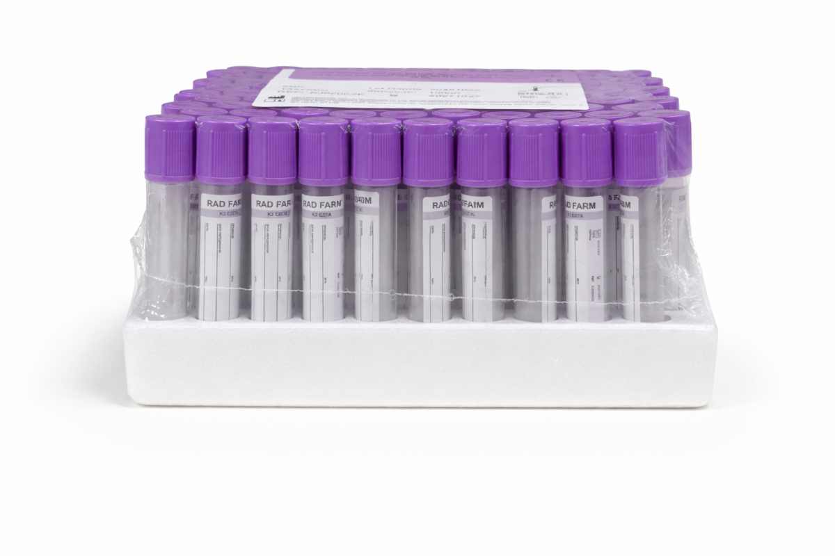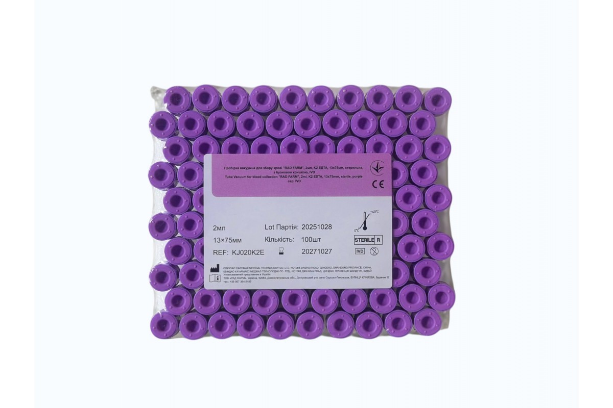 Пробірка вакуумна для збору крові "RAD FARM", 2мл, K2 ЕДТА, 13х75мм, стерильна, з бузковою кришкою, IVD