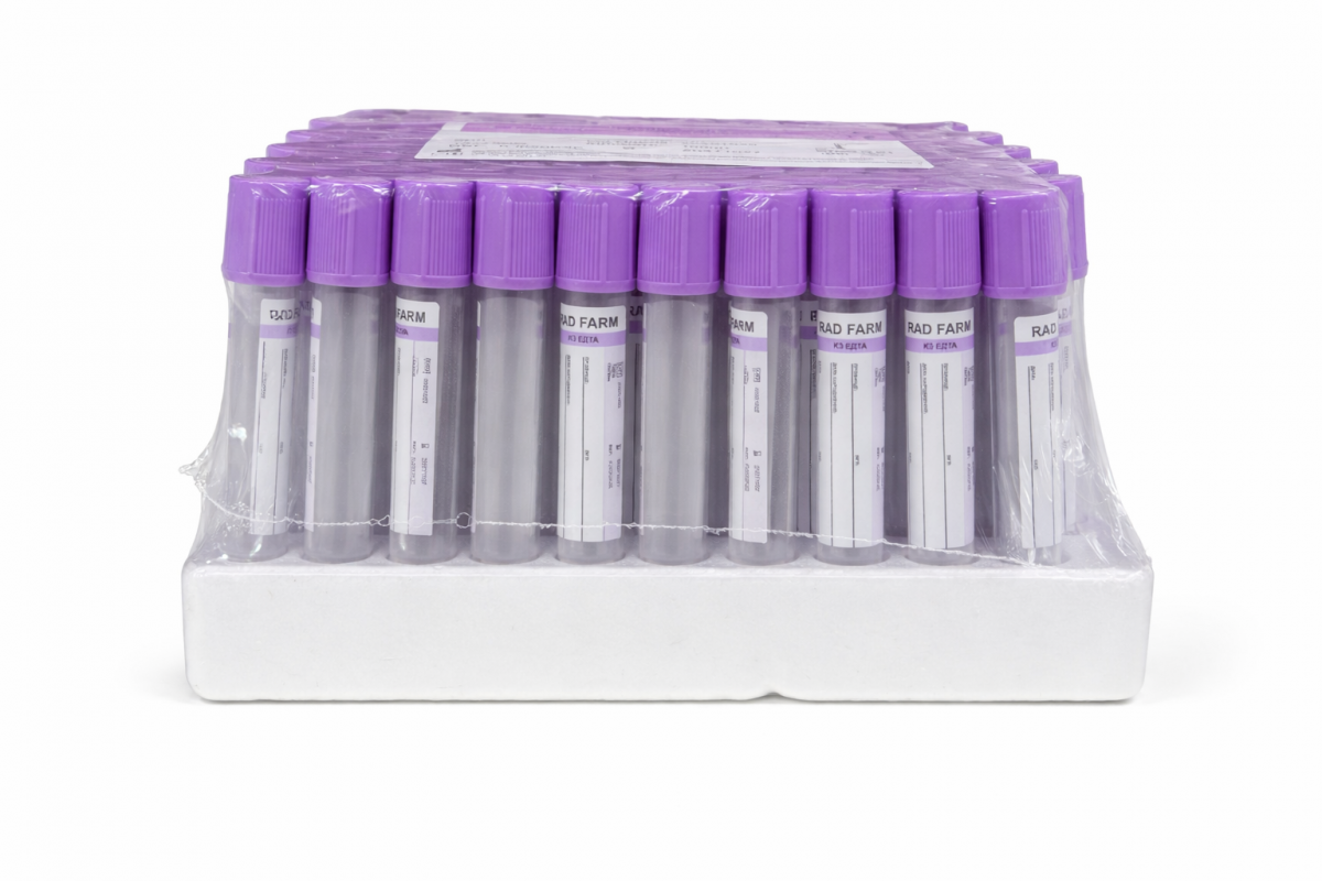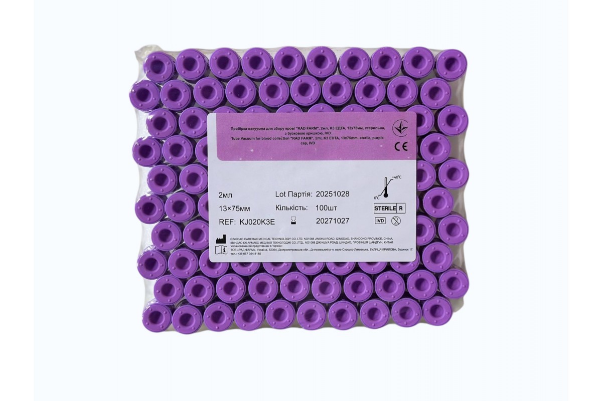 Пробірка вакуумна для збору крові "RAD FARM", 2мл, K3 ЕДТА, 13х75мм, стерильна, з бузковою кришкою, IVD