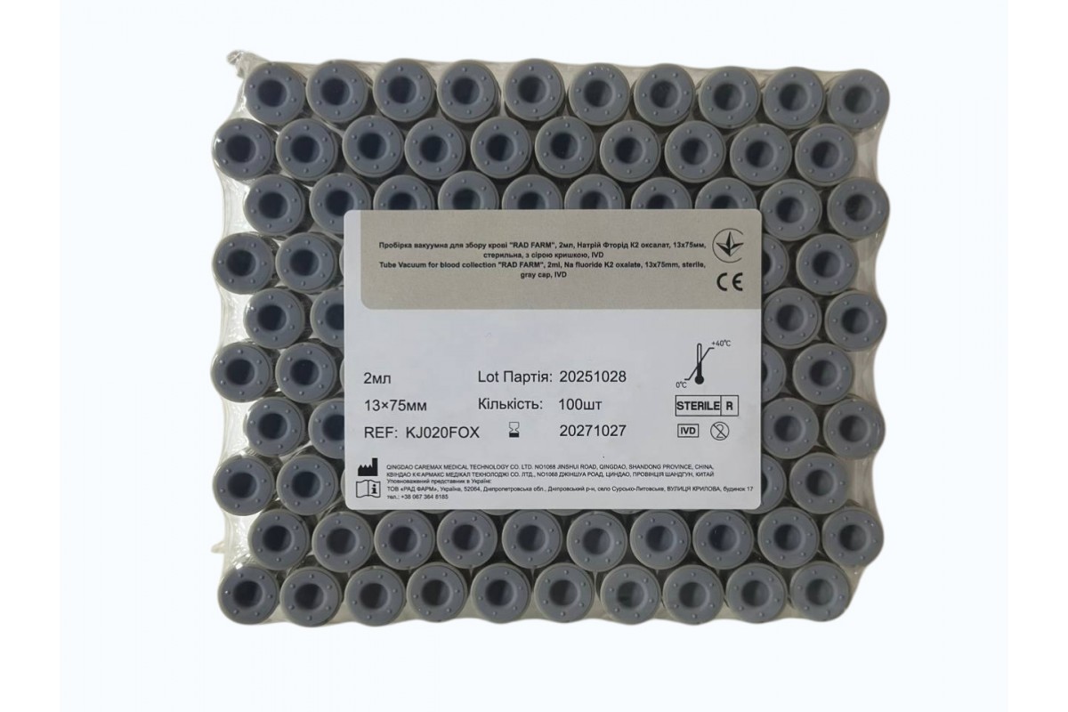 Пробірка вакуумна для збору крові "RAD FARM", 2мл, Натрій Фторід К2 оксалат, 13х75мм, стерильна, з сірою кришкою, IVD