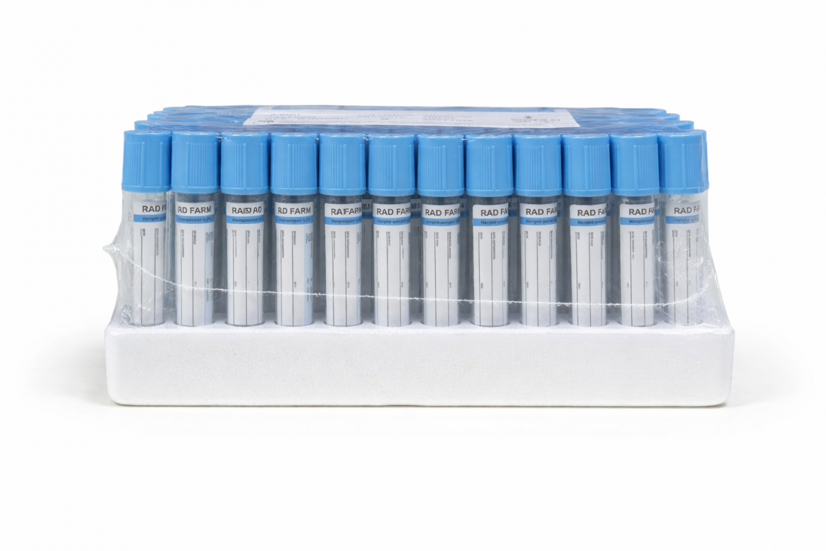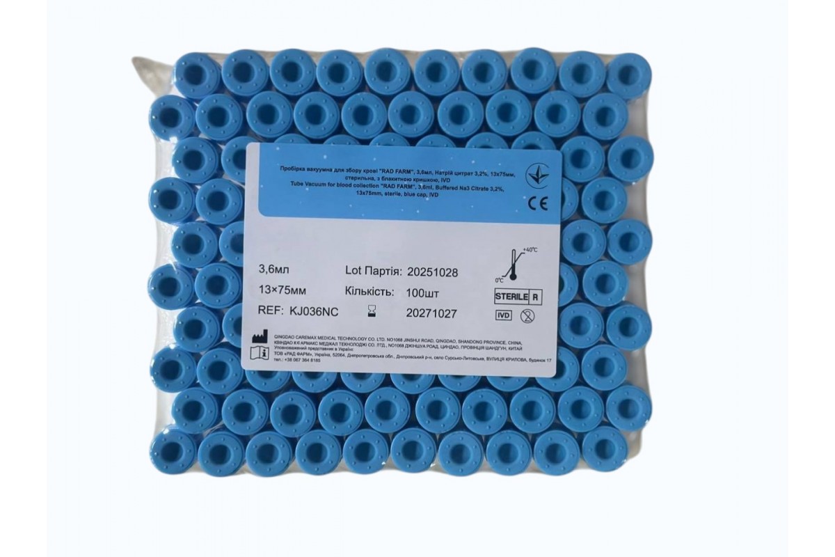 Пробірка вакуумна для збору крові "RAD FARM", 3,6мл, Натрій цитрат 3,2%, 13х75мм, стерильна, з блакитною кришкою, IVD
