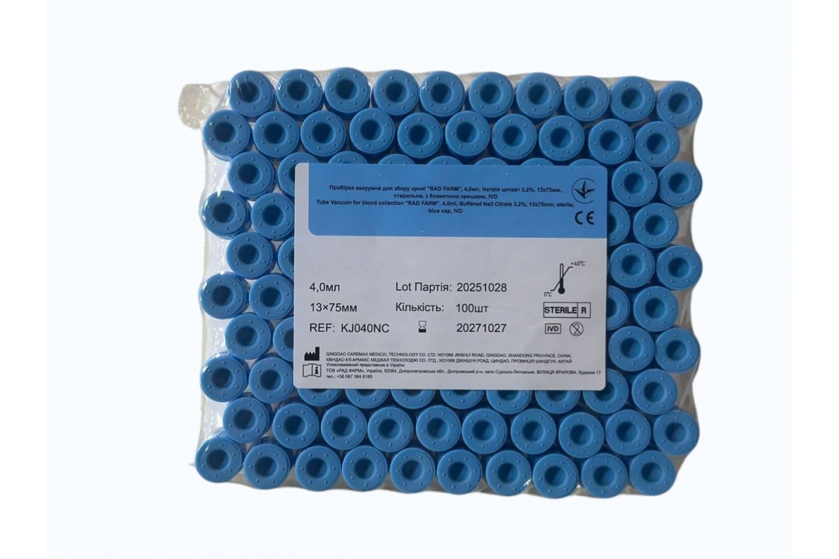 Пробірка вакуумна для збору крові "RAD FARM", 4,5мл, Натрій цитрат 3,2%, 13х100мм, стерильна, з блакитною кришкою, IVD