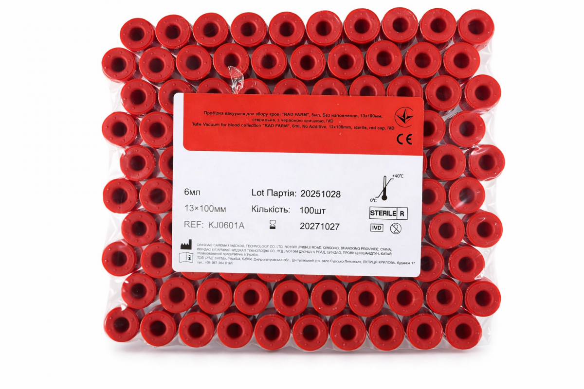 Пробірка вакуумна для збору крові "RAD FARM", 6мл, Без наповнення, 13х100мм, стерильна, з червоною кришкою, IVD