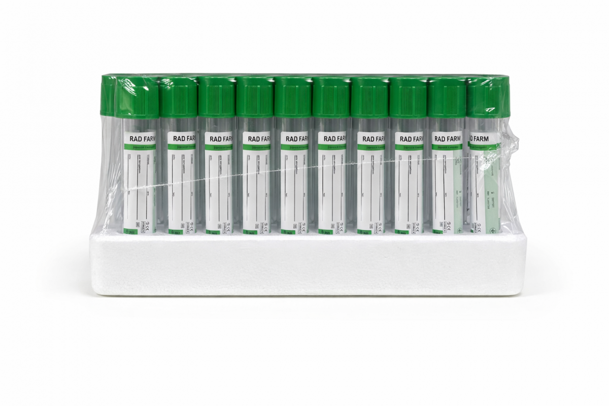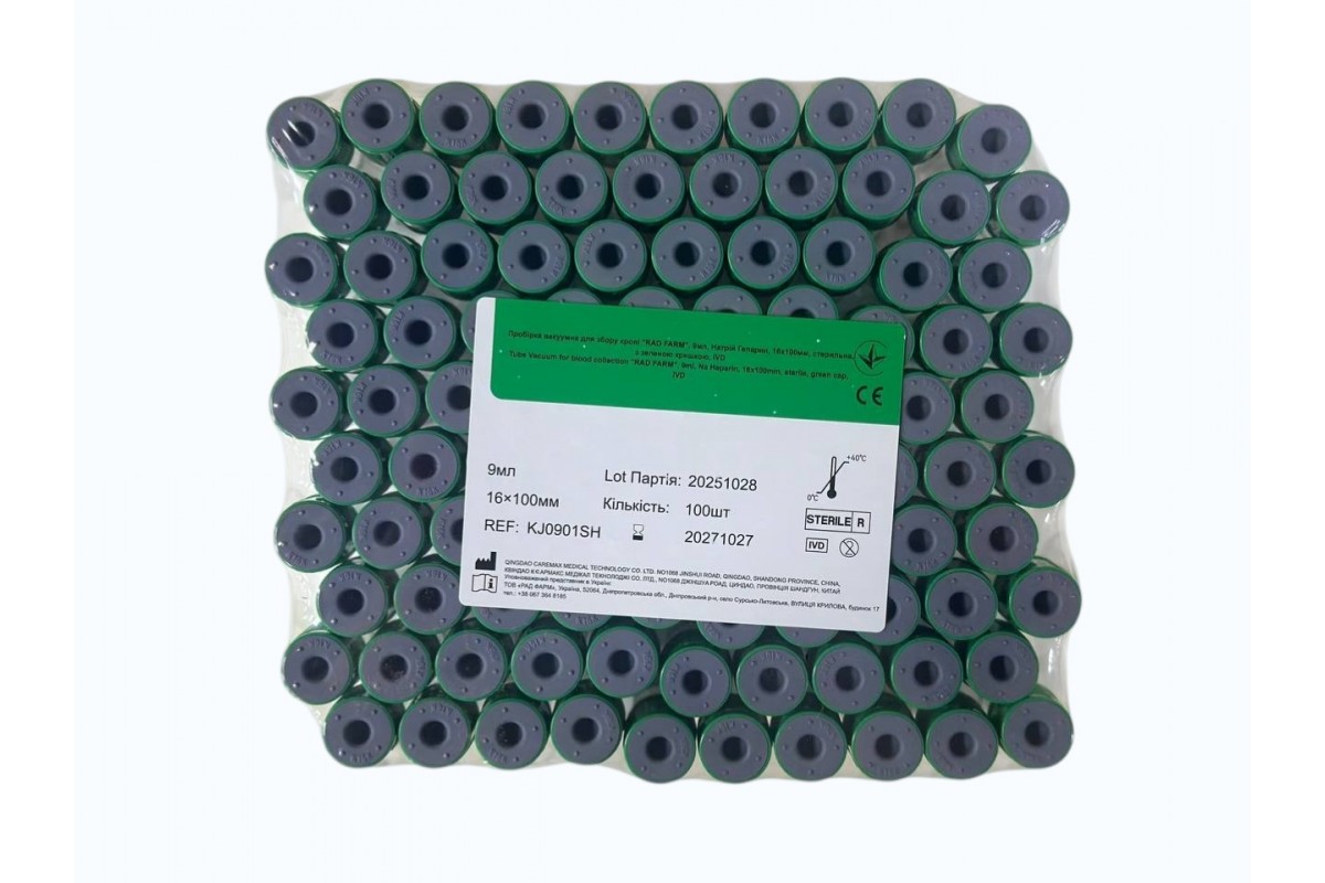 Пробірка вакуумна для збору крові "RAD FARM", 9мл, Натрій Гепарин, 16х100мм, стерильна, з зеленою к ришкою, IVD