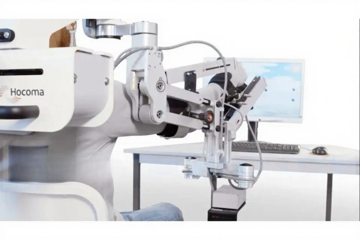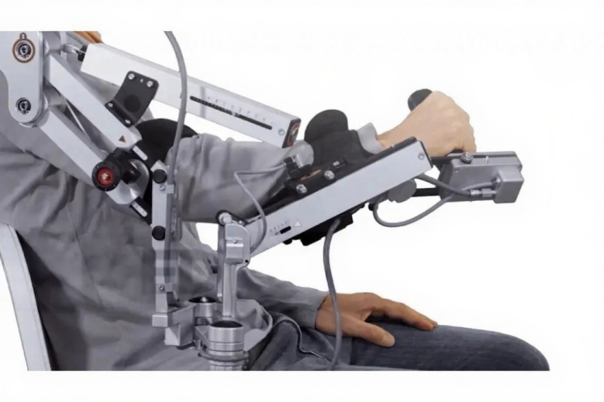Эргономичный и регулируемый экзоскелет ArmeoSpring охватывает всю руку от плеча до кисти и уравновешивает вес руки пациента.