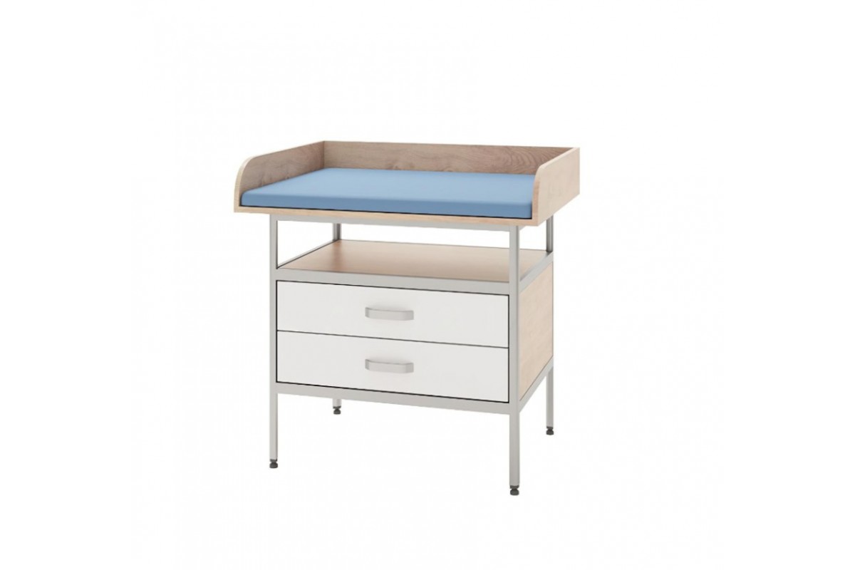- Функциональность: два вместительных выдвижных ящика для хранения подгузников, пеленок и аксессуаров; открытая полка над ящиками; регулируемые по высоте металлические опоры для удобства уборки.