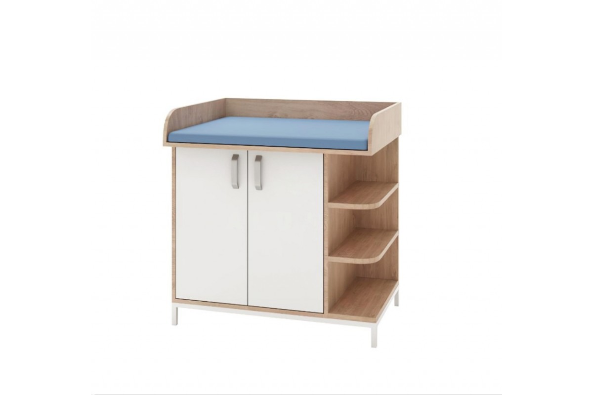 - Комплектация: верхняя пеленающая поверхность с бортиками для безопасности ребенка; двустворчатый шкаф для хранения подгузников и аксессуаров; три открытые полки сбоку для материалов под рукой или декоративных элементов.
