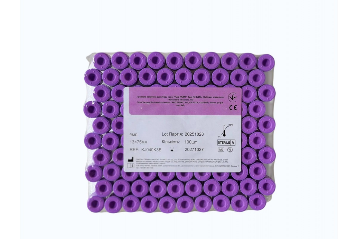 Пробирка вакуумная для сбора крови "RAD FARM", 4мл, K3 ЭДТА, 13х75мм, стерильная, с сиреневой крышкой, IVD