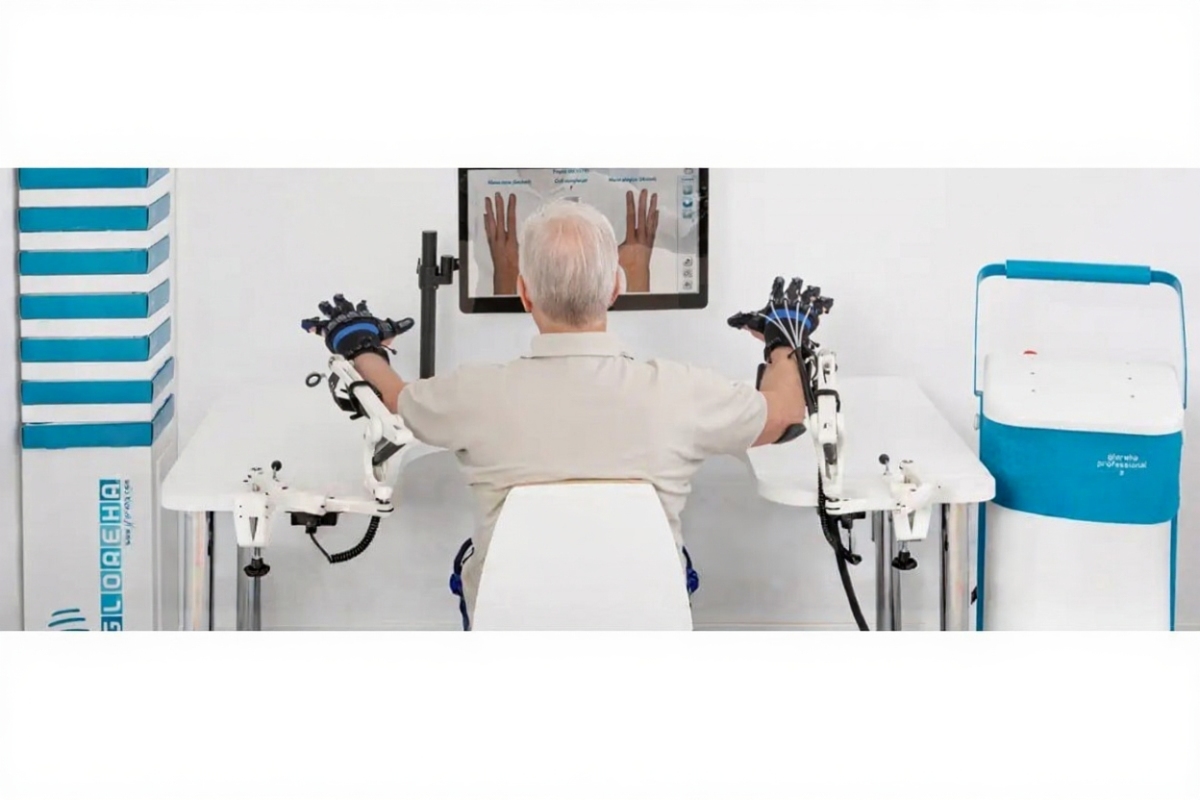 Gloreha - уникальное устройство, позволяющее проводить двустороннюю терапию, в которой частично парализованные пациенты могут использовать свою здоровую руку для создания через роботизированную перчатку аналогичного движения на пострадавшей руке. Двусторонняя терапия была разработана для облегчения выполнения функциональных упражнений. Gloreha предлагает захватывающую терапию, в которой пациенты управляют движением и взаимодействуют с окружающей средой, становясь главными героями лечения. Зеркальный нейромоторный механизм, трехмерная анимация обеих рук и двусторонние функциональные задачи могут увеличить вовлеченность пациента и стимуляцию области коры.
