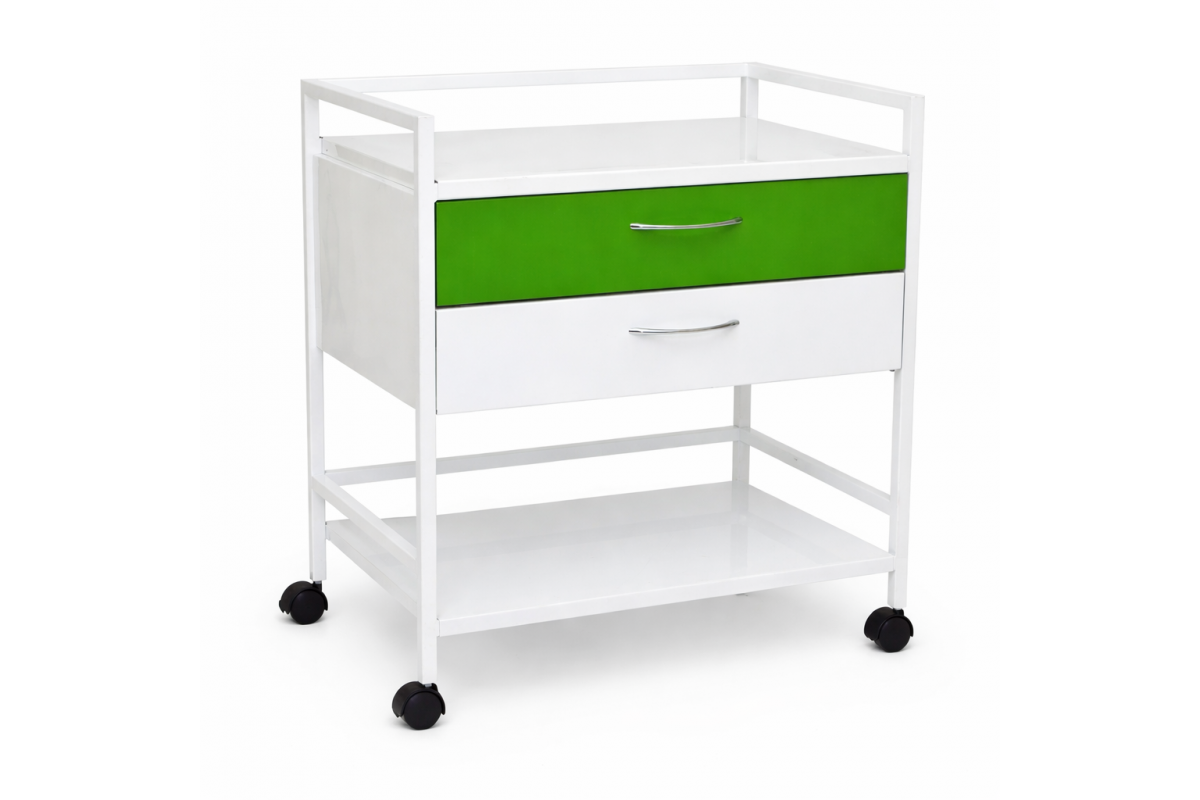 В верхней части металлического каркаса с полимерным покрытием, установленным на колесики с тормозами, располагаются два ящика. Над ящиками и в нижней части каркаса расположены две полки с трех сторон ограждения, верхние из которых одновременно выполняют функцию ручек для перемещения медицинского столика.