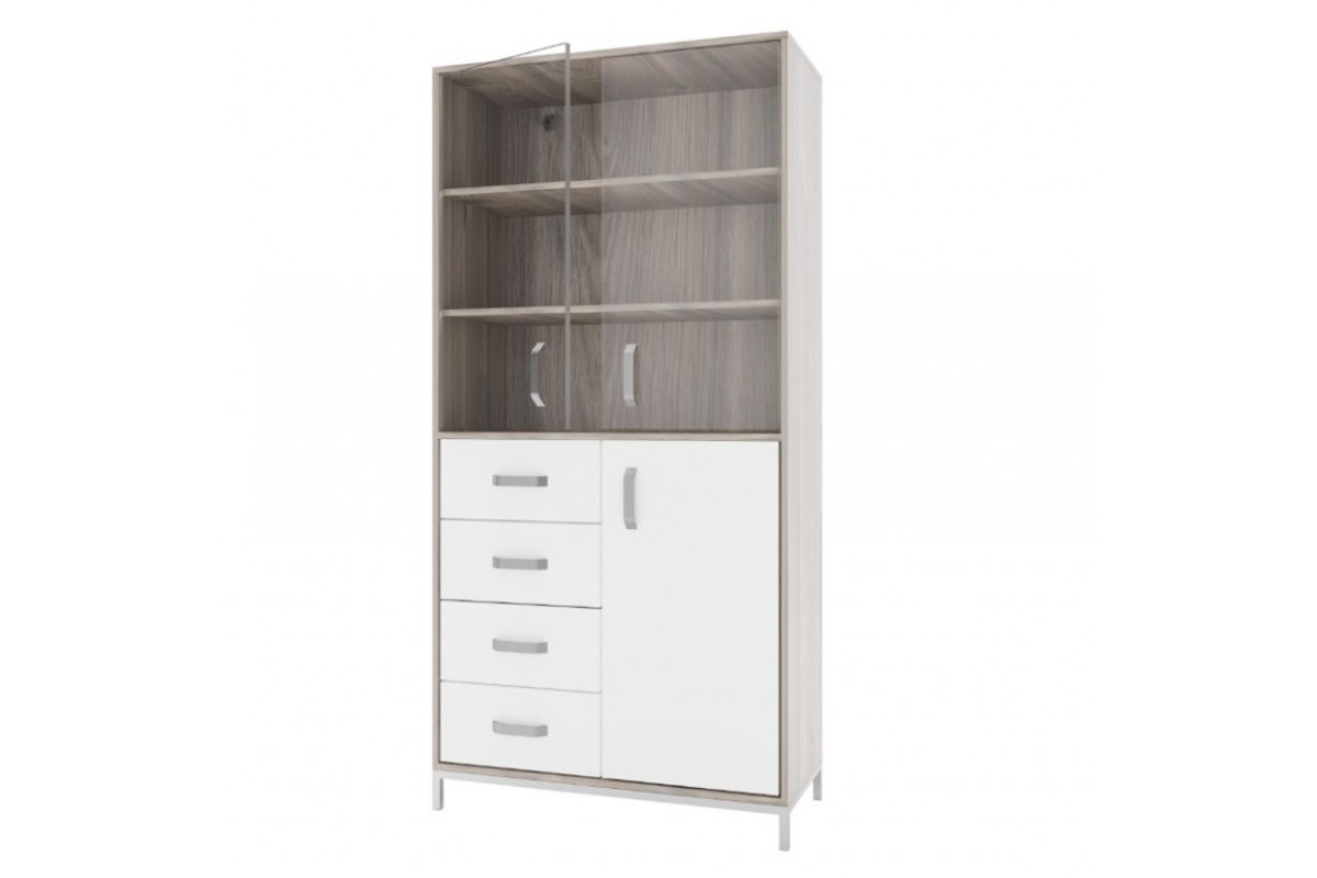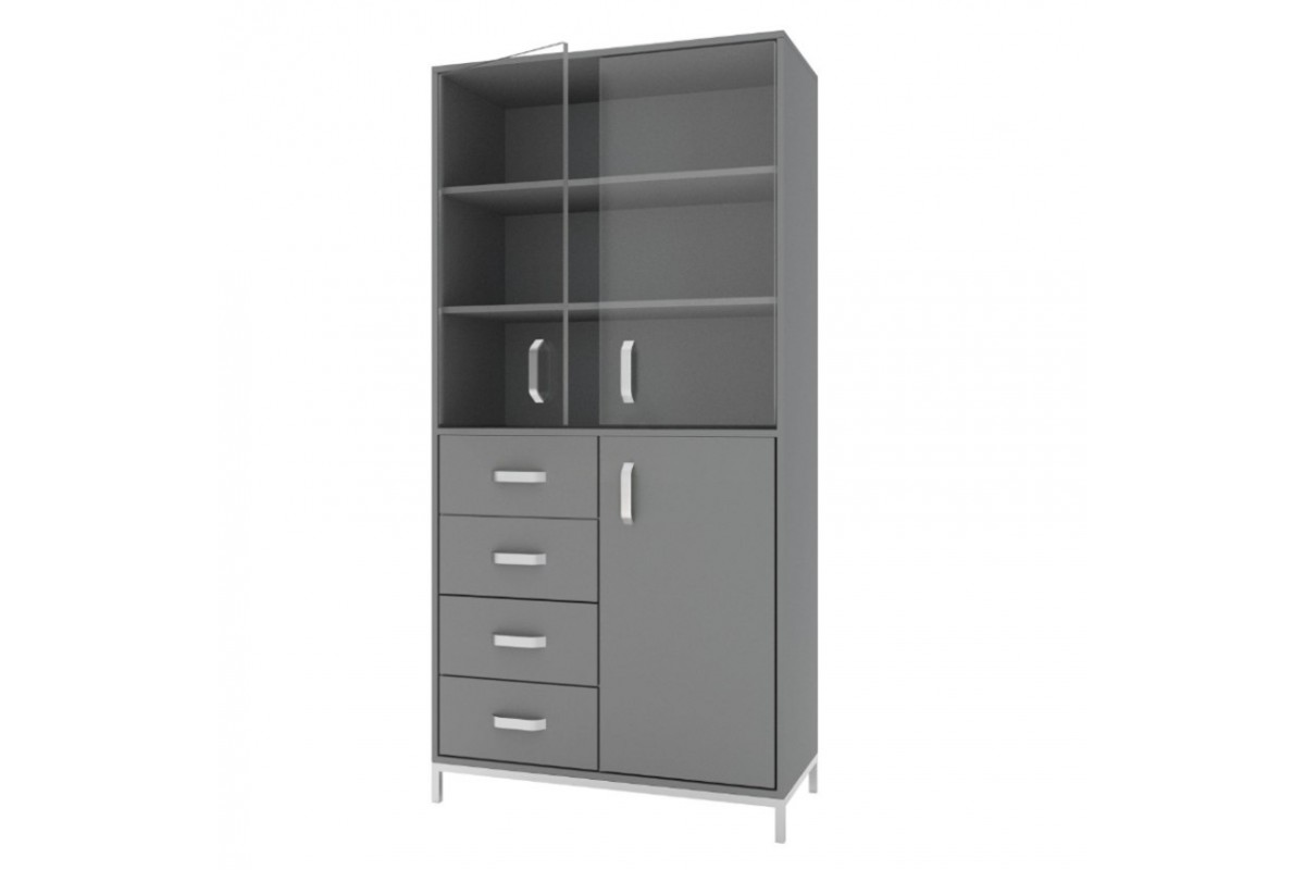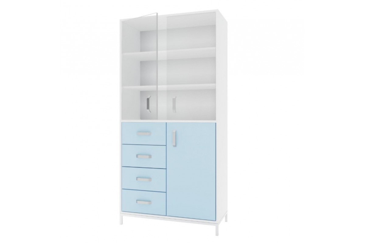 - Оптимальний дизайн: Верхня частина шафи має три полички зі скляними дверцятами, що забезпечують швидкий візуальний доступ до вмісту. Нижня частина включає чотири висувні ящики та дверцята з полицею, що дозволяє ефективно розподіляти медичні інструменти, перев’язочні матеріали чи документи.