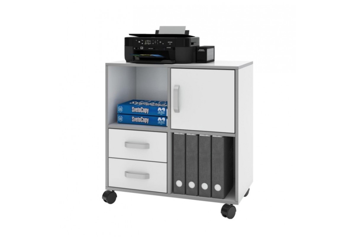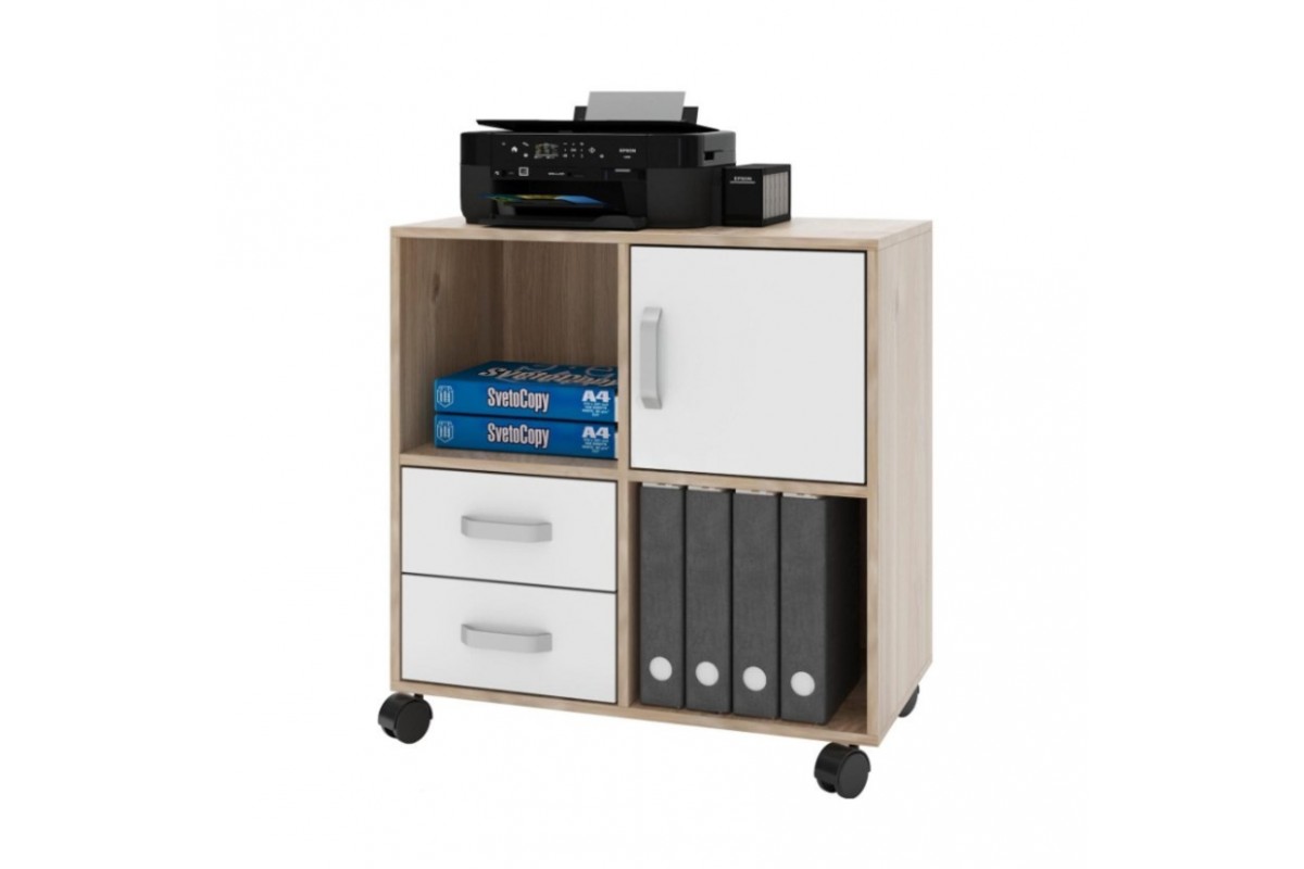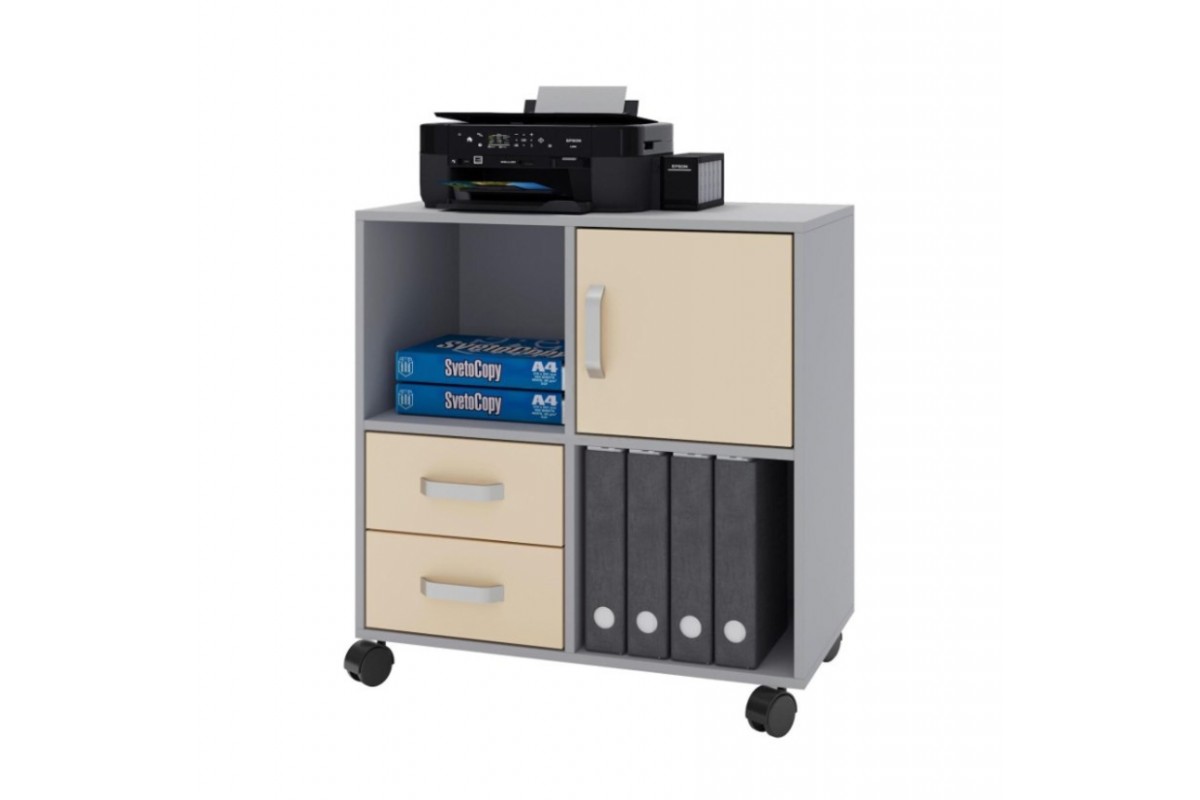 - Зручне зберігання: тумба має дві відкриті полиці, два висувні ящики та шафку з дверцятами, що дозволяє раціонально організувати робочий простір і зберігати все необхідне під рукою.